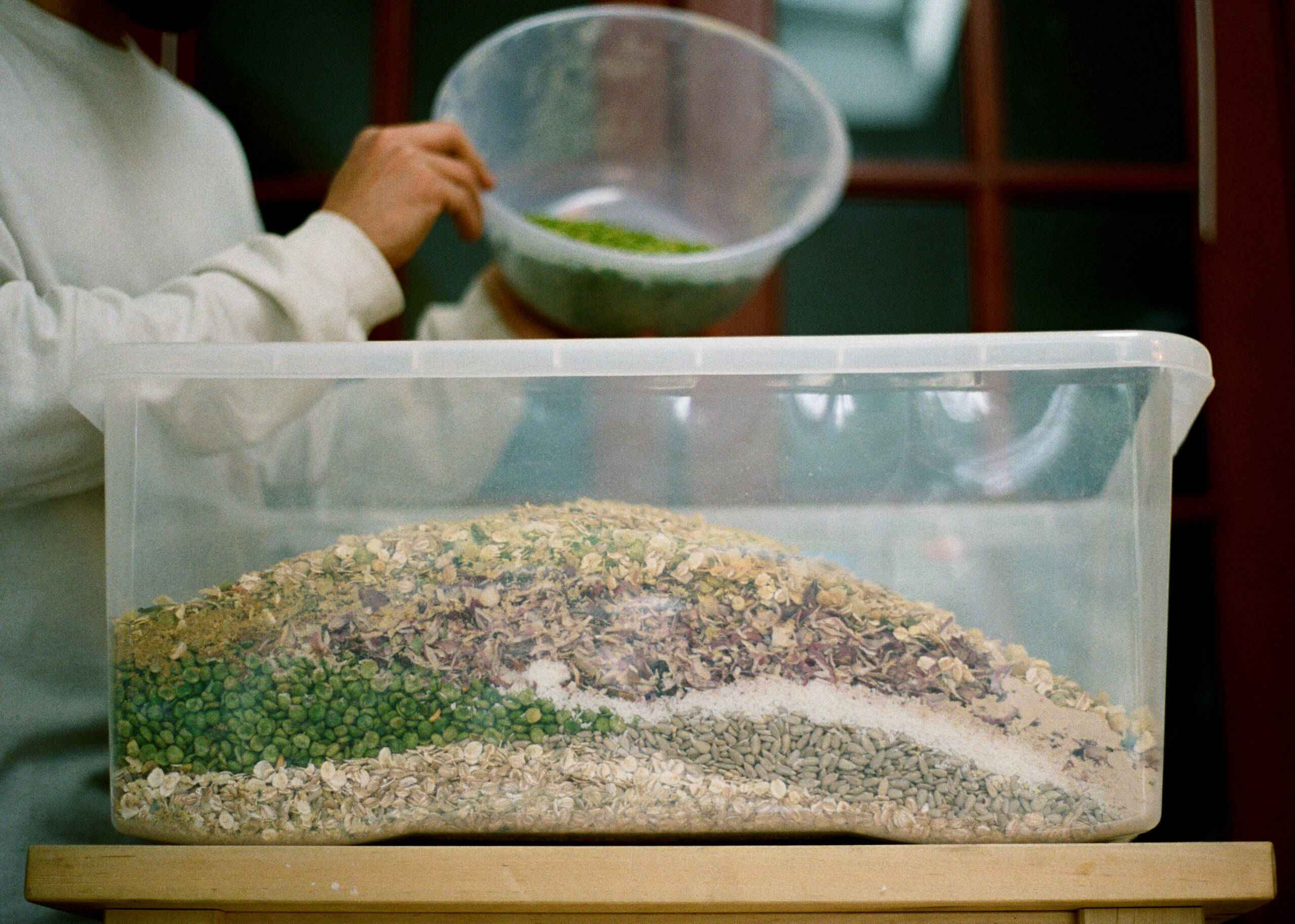 Ingredients: Rye flakes, barley flakes, roasted coconut flakes, roasted peanuts, roasted sunflower seeds, sultanas, carrot, onion, garlic, celery, kaffir lime leaf, lemongrass, ginger, black pepper, nutritional yeast, salt.