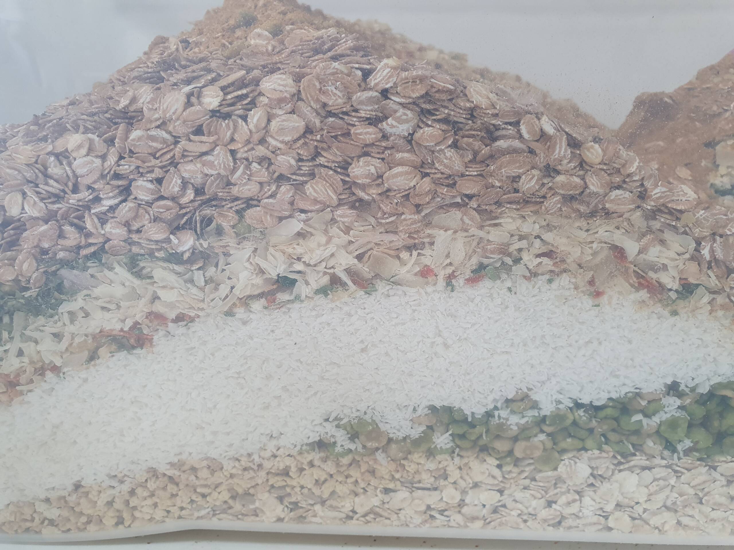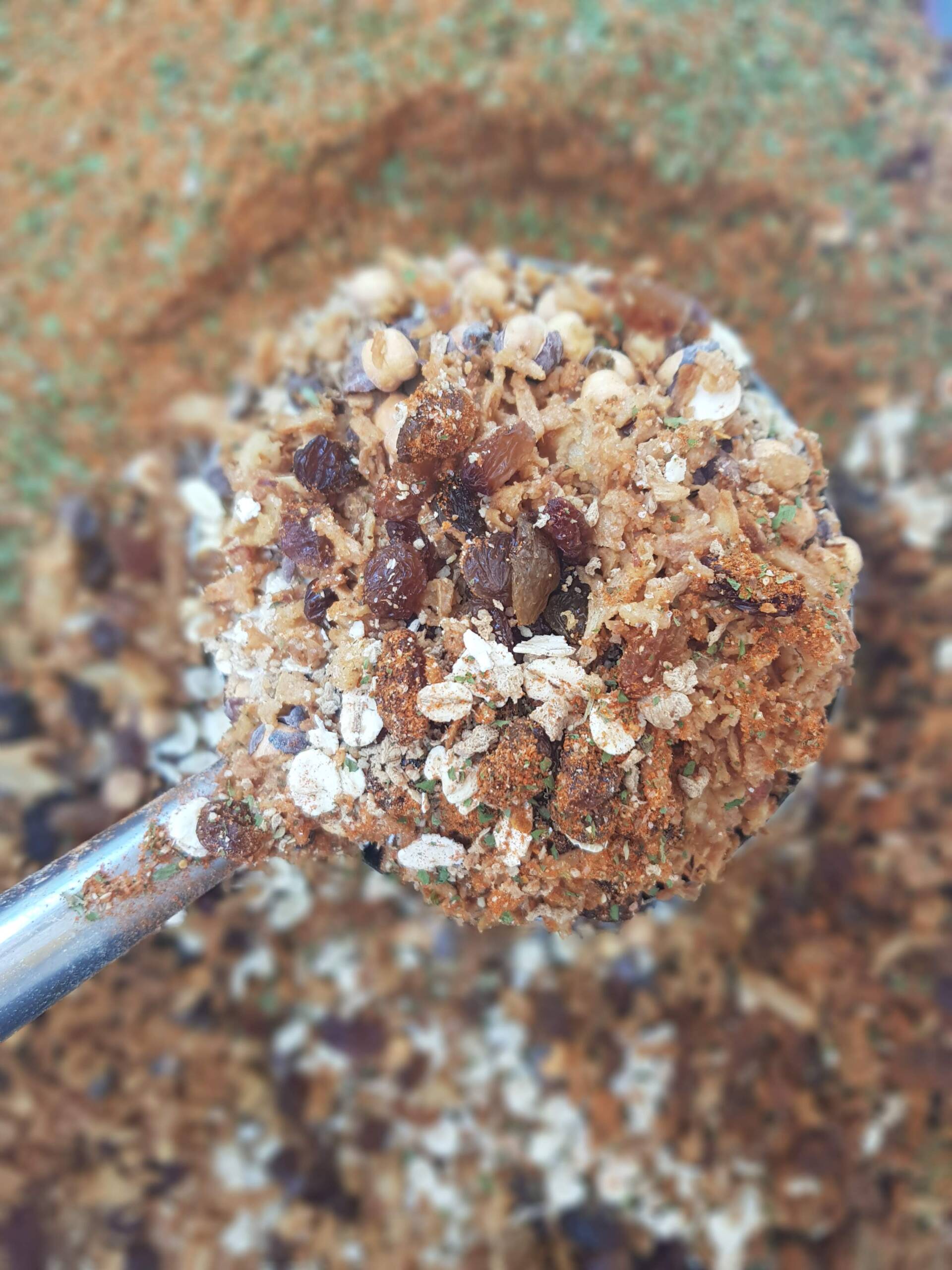 Ingredients: Rye flakes, barley flakes, roasted coconut flakes, roasted peanuts, roasted sunflower seeds, sultanas, carrot, onion, garlic, celery, tomato, fragrant herbs (basil, oregano, thyme), nutritional yeast, salt, spices.