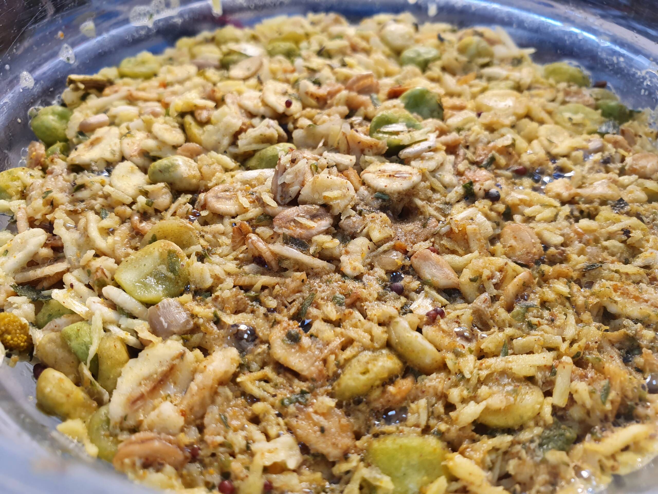 Ingredients: Buckwheat flakes, roasted coconut flakes, roasted peanuts, roasted sunflower seeds, banana chips, carrot, onion, garlic, celery, raisins, curry spice blend (turmeric, coriander, cumin, fenugreek, ginger), nutritional yeast, salt.